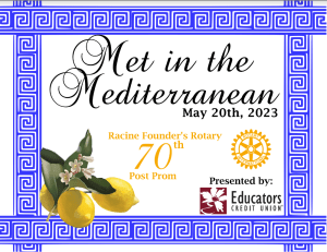 Racine Founder’s Rotary Club will continue its 70-year tradition of providing a safe celebration for graduating seniors with Post Prom 2023 “Met in the Mediterranean,” presented by Educator’s Credit Union, on Saturday, May 20 from 6 p.m. – 1:00 a.m. at the Racine County Fairgrounds. The theme for this formal indoor/outdoor gala-style event, was chosen by the senior representatives from the nine participating schools (Case, Horlick, Lutheran, Park, Prairie, R.E.A.L, St. Catherine’s, Union Grove and Walden III high schools).