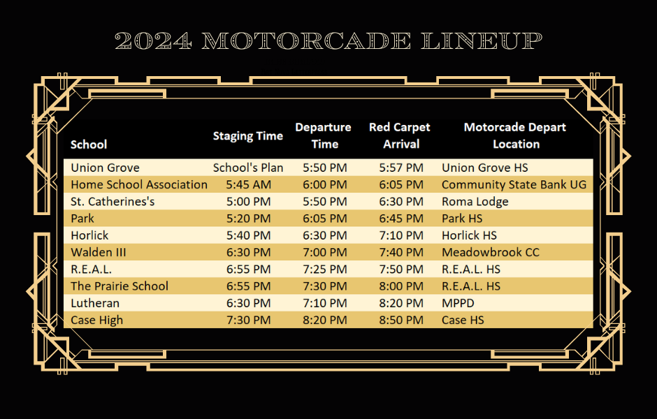 To be able to safely provide a motorcade for the students to the Racine County Fairgrounds some accommodations have needed to be made, including changing the starting locations for some schools differing from their home schools. We work very closely with local law enforcement to provide a safe, fun, and unique never been seen before motorcade! More specific information about this will be provided to students through the schools and here as it is developed.